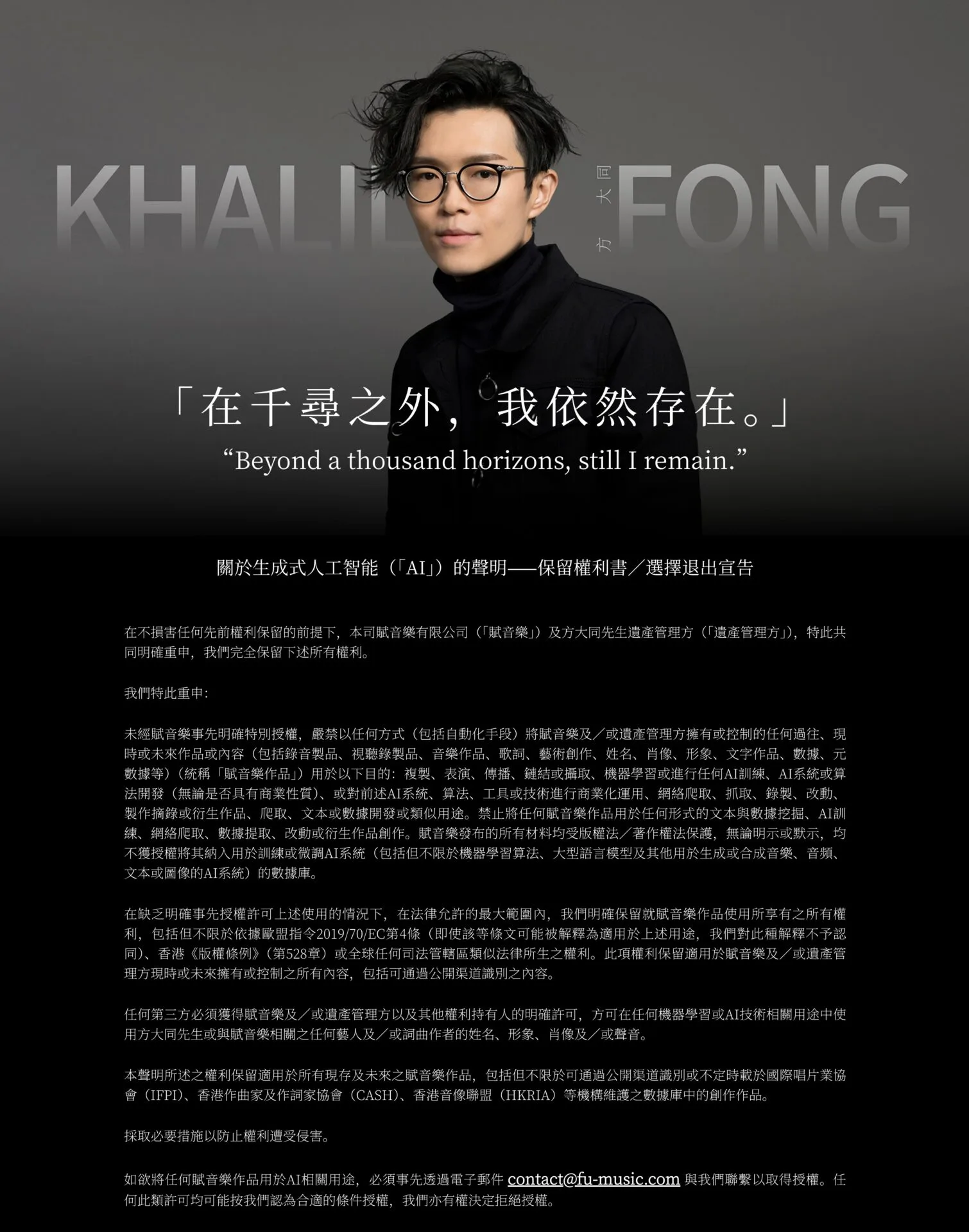 已故歌手方大同所屬唱片公司賦音樂有限公司,於10月5日發表聲明,宣告「選擇退出」(Opt-Out)AI場域,表明立場嚴格禁止任何未經事前明確授權,將方大同的任何內容用於人工智慧(AI)領域。